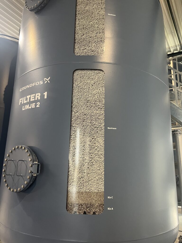 Vandet iltes, filtreres gennem sand og grus og løber derefter over i rent-vandstankene. Simpelt – men effektivt”.
